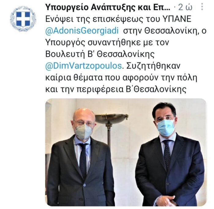 Ο Υπουργός Ανάπτυξης και Επενδύσεων κ. Άδωνις Γεωργιάδης συναντήθηκε με τον Βουλευτή της Β’ Περιφέρειας Θεσσαλονίκης κ. Δημήτρη Βαρτζόπουλο ενόψει της επίσκεψης στη Θεσσαλονίκη την Τετάρτη.