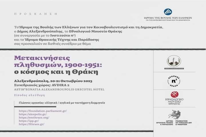 Το Ίδρυμα της Βουλής των Ελλήνων για τον Κοινοβουλευτισμό και τη Δημοκρατία διοργανώνει από κοινού με το Δήμο Αλεξανδρούπολης, το Εθνολογικό Μουσείο Θράκης (σε συνεργασία με το Ινστιτούτο Π2) και το Ίδρυμα Θρακικής Τέχνης και Παράδοσης διεθνές συνέδριο με θέμα «Μετακινήσεις πληθυσμών, 1900-1951: ο κόσμος και η Θράκη / Population Movements, 1900-1951: the world and Thrace», στις 20 και 21 Οκτωβρίου 2023 στον συνεδριακό χώρο Avdira 2 στο ξενοδοχείο ASTIR*EGNATIA HOTEL στην Αλεξανδρούπολη.