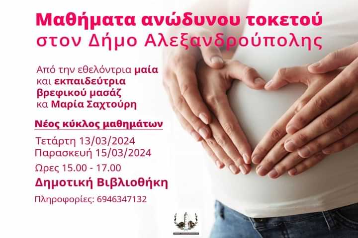 Ο Δήμος Αλεξανδρούπολης σε συνεργασία με το Γραφείο Εθελοντισμού διοργανώνουν μαθήματα ανώδυνου τοκετού από την εθελόντρια μαία και εκπαιδεύτρια βρεφικού μασάζ κα Μαρία Σαχτούρη.