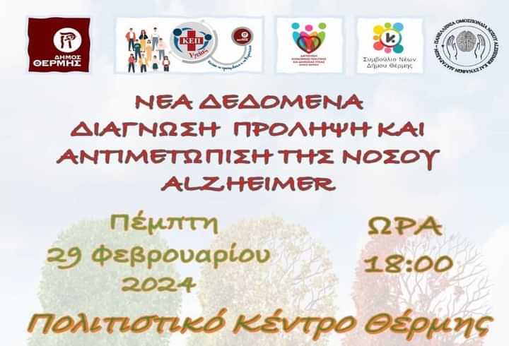Το ΚΕ.Π. Υγείας της Διεύθυνσης Κοινωνικής Πολιτικής και Δημόσιας Υγείας, η Ελληνική Εταιρεία Νόσου Alzheimer και Συγγενών Διαταραχών Θέρμης και το ΚΑΠΗ Θέρμης σε συνεργασία με την Πανελλήνια Ομοσπονδία Νόσου Alzheimer και Συναφών Διαταραχών και διοργανώνουν εκδήλωση με τίτλο Νέα Δεδομένα στην Διάγνωση, Πρόληψη και Αντιμετώπιση της Νόσου Alzheimer.