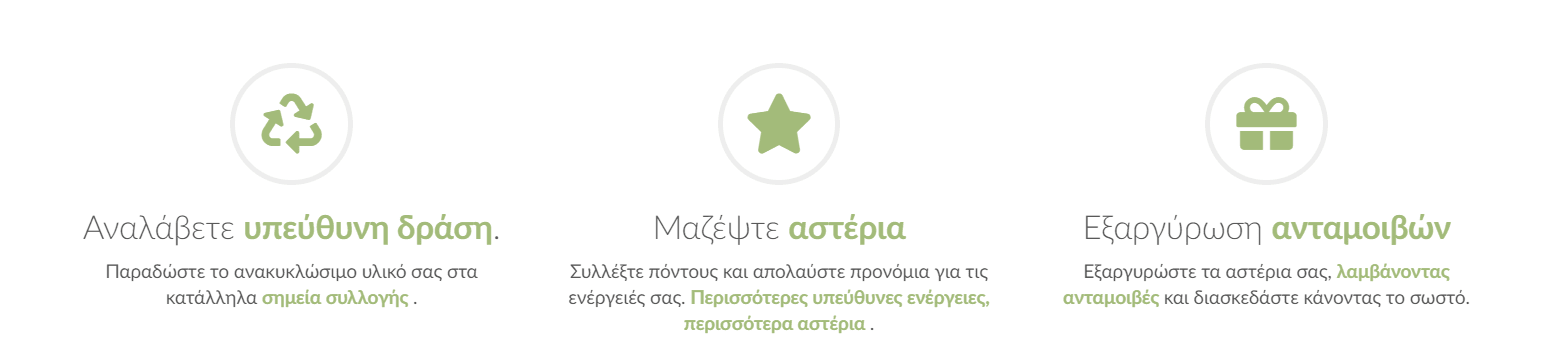 Κάθε φορά που παραδίδετε ανακυκλώσιμα υλικά στα Πράσινα σημεία συλλογής του Δήμου Παύλου Μελά, η ενέργειά σας ανταμείβεται με ειδικό κουπόνι αστεριών/πόντων, το οποίο καταχωρείτε στην πλατφόρμα για να ανταλλάξετε τους πόντους σας με δώρα και προσφορές από τοπικά καταστήματα.